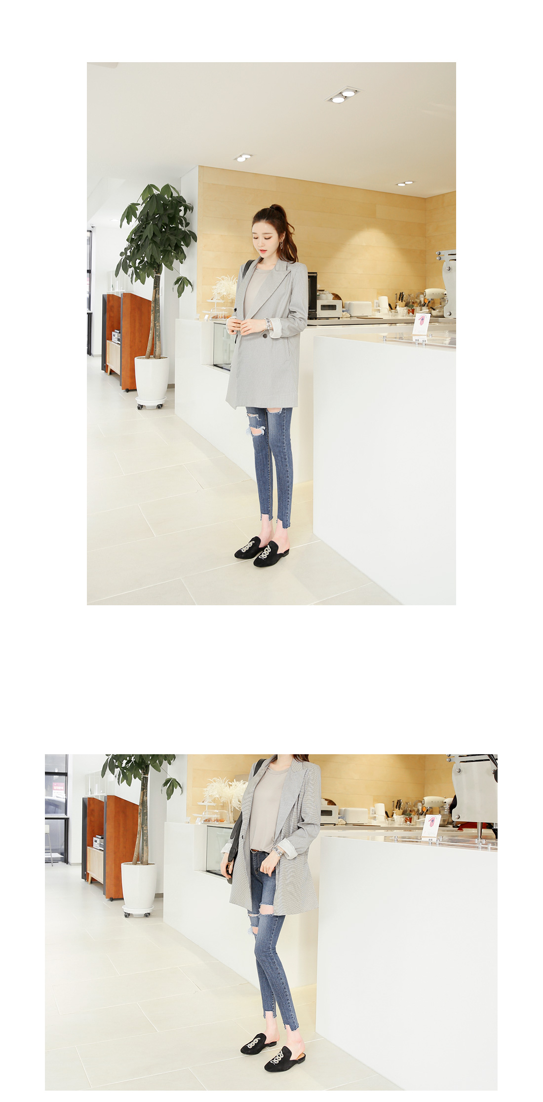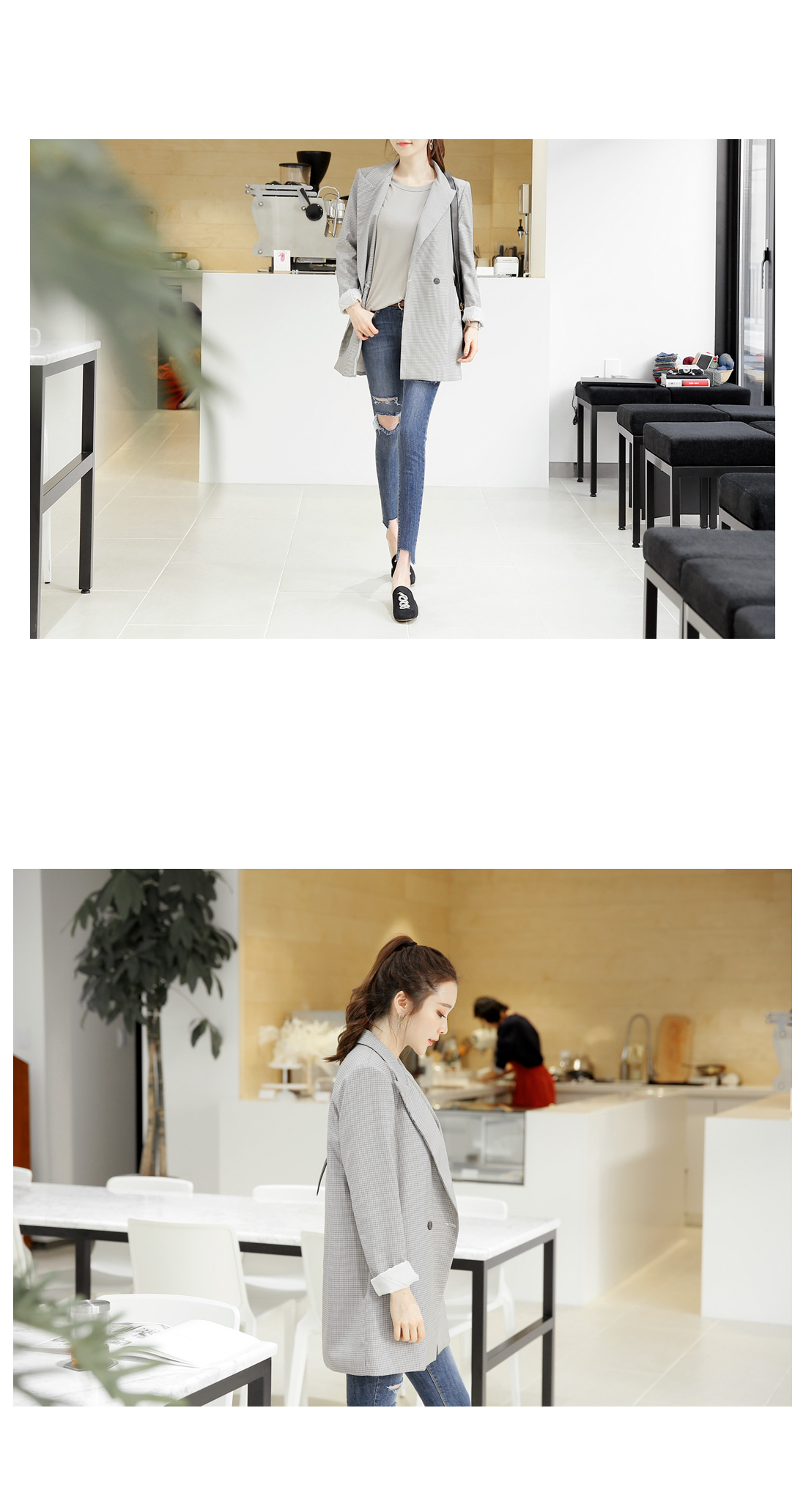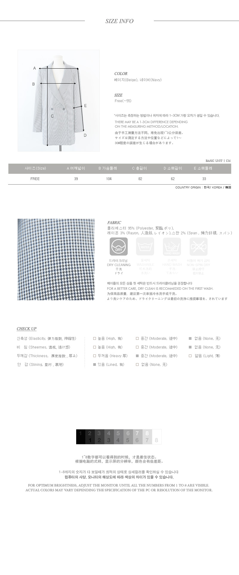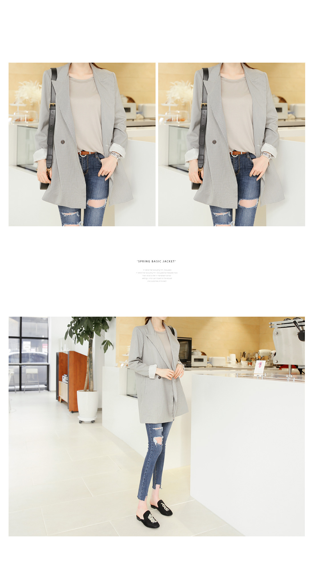 심플해서 더 매력적인 체크자켓! 기본 더블핏으로 소장가치 높은 아이템^^ 적당한 두께감으로 간절기시즌 데일리 아우터가 되어줄 자켓이구요 잔잔한 미니체크 패턴이 다양한 룩에 심플한 포인트를 준답니다~ 베이직한 핏과 힙을 가려주는 기장으로 한층 더 편안하게 연출할 수 있구요 유행타지않는 스타일이라 오랫동안 소장하기 좋은 기본 더블자켓이랍니다^^ 캐주얼룩,페미닌룩 등 어떤룩에나 이지하게 어울리는 체크자켓이에요!