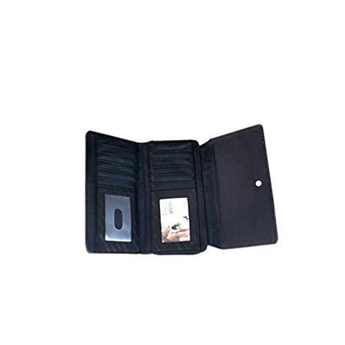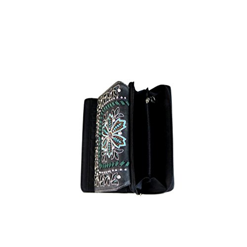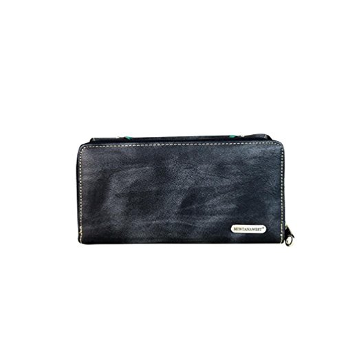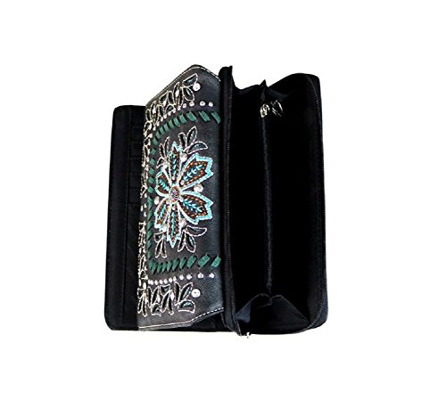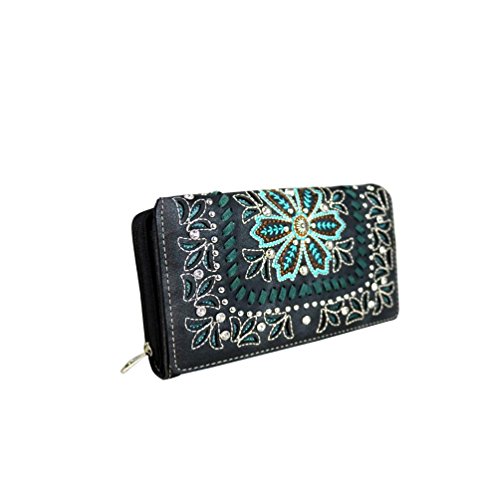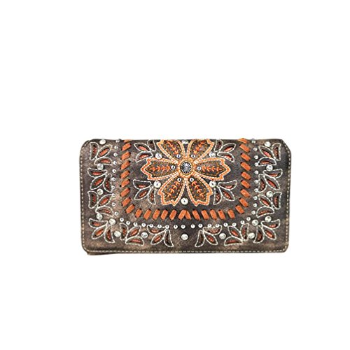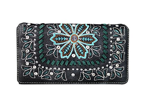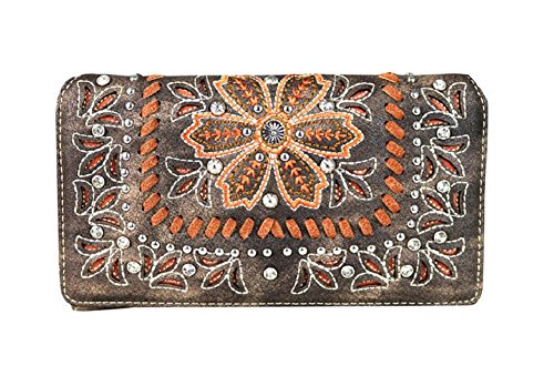 Binding : Apparel Product Description Made of a distressed look PU leather, this western secretary wallet style has: Embroidered floral and cut-out fleur de lis with matching color inlay Accented with crystal and silver stud Leather stitch detail Multiple card slots and 2 long slot compartments Zipper closure on the back with single compartment divided by a medium zippered pocket Measures: 7.5" x 1.25" x 4.75" 0