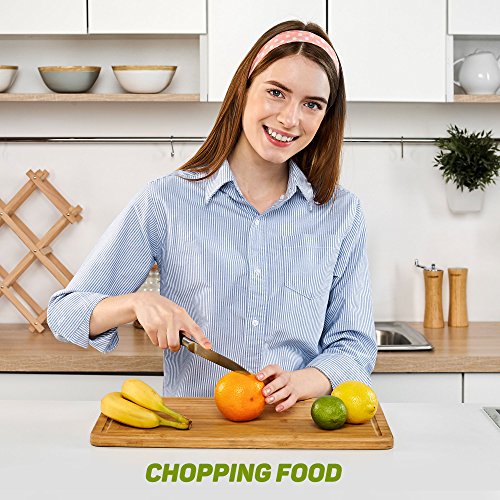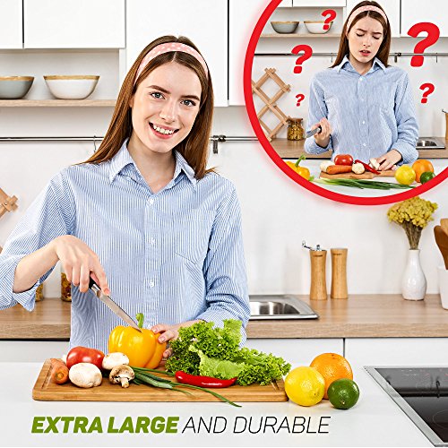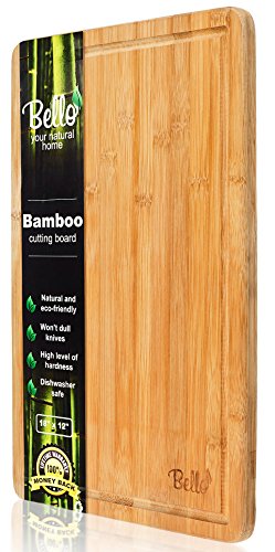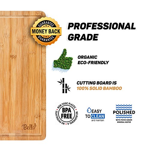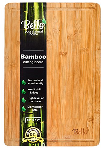 ✓EXTRA LARGE AND DURABLE: Allows more space for chopping and slicing. Prep without the need to move things off the board. Bello Bamboo Cutting Board handles all of your home kitchen chopping and slicing tasks and has a deep Juice Drip Groove on One Side.