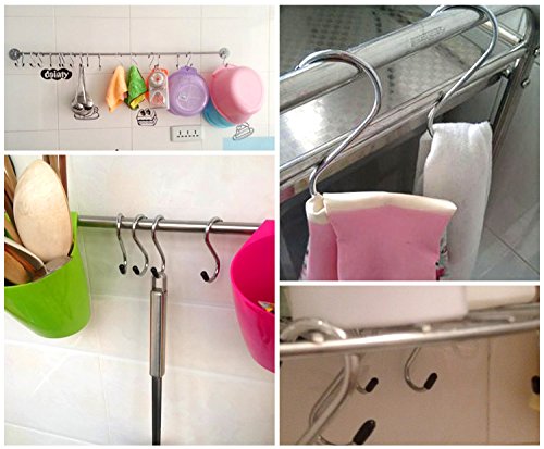 Multi-Uses: Super practical S hooks,can be used both indoor and outdoor in any weather condition! Hanging pans,pots,spatulas,coffee mugs, hand towels,potholder, kithen utensils to organize your kitchen with ease;Organizing your closet by hanging scarfs,purses,belts,hats,tank tops,jeans,jewelry organizers;Use them in the bathroom to hang washcloths,loofas,body brushes,toiletries,towels and robes without screws or adhesives;Organize tools in the garage and hang plants in your garden etc!