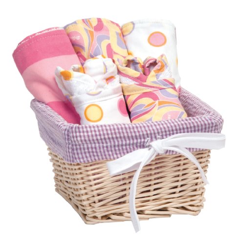-. Feature : Set features two bibs and three burp cloths packaged inside a wicker basket with removable purple gingham seersucker liner / Bib and burp cloths feature 100% cotton P.R.Ints on the front and are backed with soft, absorbent cotton terry cloth / Burp Cloths measure 10 in x 13 in