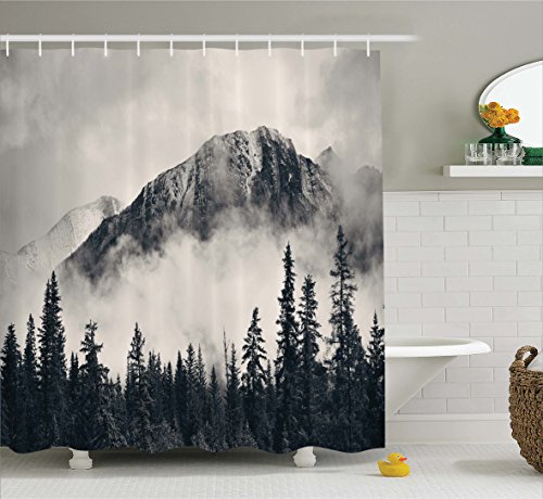 National Parks Home Decor Shower Curtain by Ambesonne, Canadian Smokey Mountain Cliff Outdoor Idyllic Photo Art, Fabric Bathroom Decor Set with Hooks, 75 Inches Long, Black and White