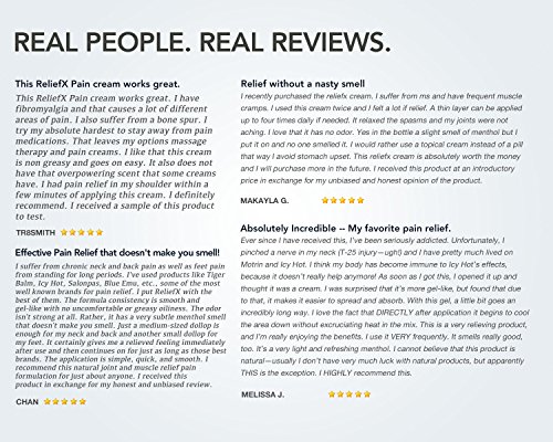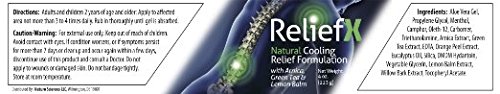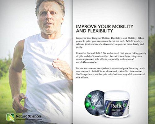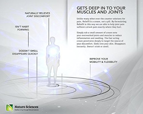 -. Feature : ReliefX contains high concentrations of Arnica, a powerful anti-inflammatory that may help relieve pains and aches fast. / Penetrates Deep in to Your Muscles and Joints. The fast acting cream penetrates deeply to target the source of your discomfort. Sinks into your skin. Disappears instantly. Doesn't stink or smell. / May Help Improve Your Range of Motion, Flexibility, and Mobility. When you're in pain, your movement is constrained. ReliefX quickly relieves joint and muscle discomfort so you can move easily. / Promotes Ache Relief for temporary discomfort relief without any unwanted side effects. / Smells Great! Works great! Relieves Great! Great in Conjunction with Pain Therapy!