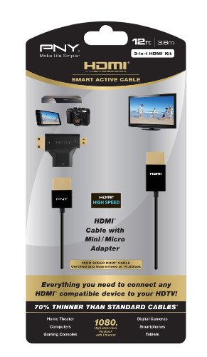 PNY's Active High Speed HDMI Cables enable 1080p HD video and sound, all in an innovative, ultra-thin, and flexible design. Take your handheld device’s content and view it in HD on your HDTV or monitor. These sleek and portable cables allow super easy and convenient access to presentations, documents, images, and more. At a mere 3.5mm in diameter they are more pliable for ease of use and compact enough to transport in your jacket pocket or handbag. It is available in a convenient 12ft length, so you can use your portable devices with ease like a remote control to view pictures and videos from the comfort of your couch. PNY's Active High Speed cables are superior to passive cables because of a built-in chip that guarantees 10.2Gbps speed and prevents signal loss. PNY’s Active High Speed 3-in-1 cables are the ultimate accessories for your tablet and smartphone.