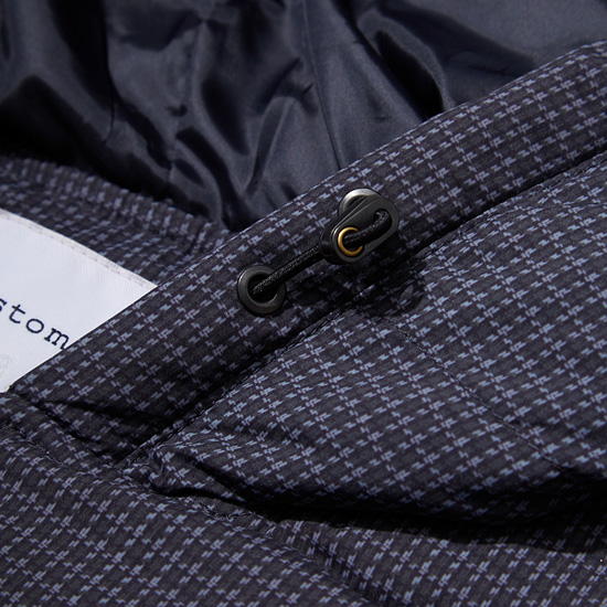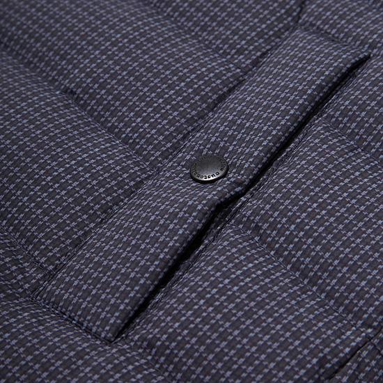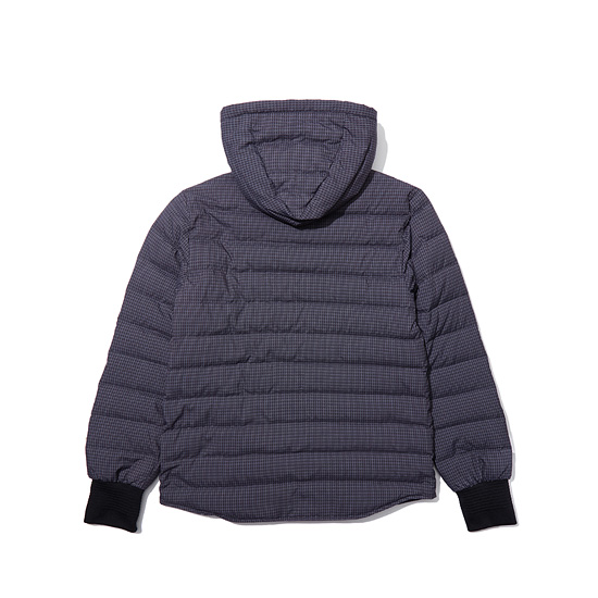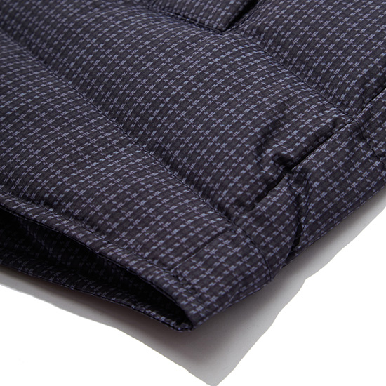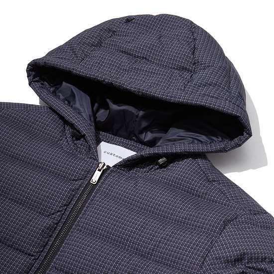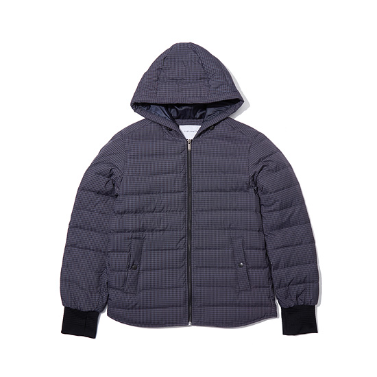 잔잔한 모노체크 패턴이 프린트된 소재를 사용한 남성 구스 다운 점퍼.