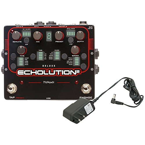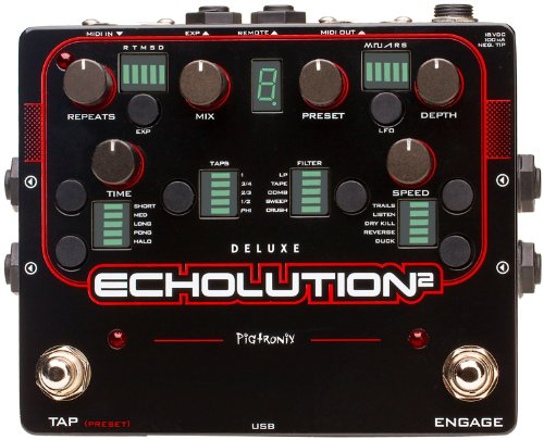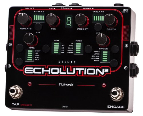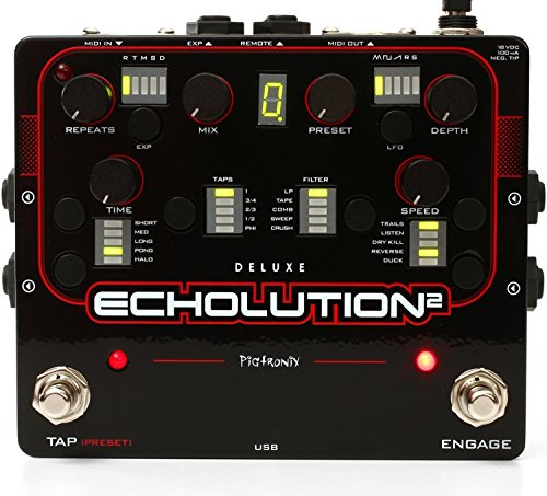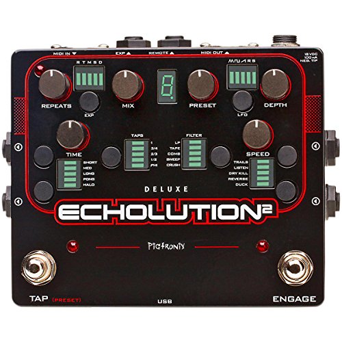 Studio : Pigtronix Publisher : Pigtronix Binding : Electronics Product Description Pigtronix Exhalation 2 represents a unique marriage of analog tone shaping and DSP processing designed to deliver the ultimate delay pedal experience. Exhalation 2 achieves the ambient richness of the finest tape echo units by using 100% analog Class-A, discrete transistor limiters as well as non-linear tape emulator stages and filters to massage the audio coming through the delay line. Fully capable of handling instrument and line level sound sources, the Exhalation 2 delivers low-noise, high-headroom delay processing with any amp, mixer or DAW rig. Exhalation 2 uses a 24-bit, variable clock, multi-tap delay line where both the read and write heads are simultaneously modulated by a multi-waveform LFO. Changing the delay time results in the smooth pitch bending of an analog delay system but with a Pigtronix twist that allows drastic delay time changes to create musically related octave intervals. The resulting echoes are then processed through an array of filters and special effects, which can be manipulated via assignable expression pedal routing as well as envelope control for each knob. Every feature and algorithm on the E2 can be run simultaneously, in any combination, and all functions of the Exhalation 2 are MIDI controllable. Accessing and navigating the vast palette of sounds available within the Exhalation 2 is easy. Since the pedal is completely programmable, any sound that has been designed using the Exhalation 2 or Exhalation 2 Deluxe pedal can be saved to the unit itself and exported for sharing with friends and other musicians. A dedicated PC/MAC application handles preset management as well as firmware upgrades and also provides Exhalation 2 users with real time access to the sounds and advanced editing functionality of the Exhalation 2 Deluxe. 0