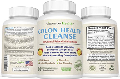 - Feature : 100% SATISFACTION GUARANTEE: Feel great and detoxed or your money back! / VIMERSON HEALTH COLON CLEANSE WITH AFRICAN MANGO will help reduce bloating, remove harmful toxins from the body, lose weight, flatten your belly, increase overall health and regularity, prevent constipation, improve digestive health and restore the good bacteria in your colon / 100% ALL NATURAL and NON-GMO! No hormones, no preservatives, no artificial ingredients, no fillers, no binders, no jitters, no antibiotics, no chemicals, no gluten, no wheat, no soy, no fat, no cholesterol, no dairy, no sugar, no egg, no caffeine, NO SIDE EFFECTS. The most Pure, Natural and Healthy way to cleanse your intestines and feel better / DON'T WAIT ANY LONGER! Get rid of bloating and the toxins that harm you. Vimerson Detox Cleanse with african mango will help you achieve your goals quickly. Don't compromise your health by using cheap products of questionable quality that may give you diarrhea, awful cramps and pain. Choose the most efficient and pure supplement with maximum results, Vimerson Health Colon Cleanse! / MADE IN THE U.S.A. in a CMG Certified, NSF Certified and FDA Approved facility. This product is 3rd Party Tested to assure the highest quality and purity