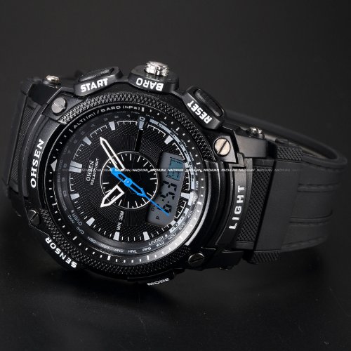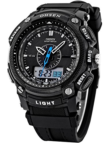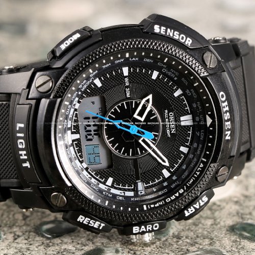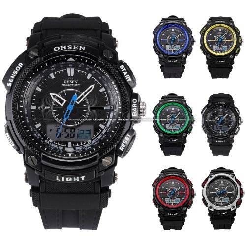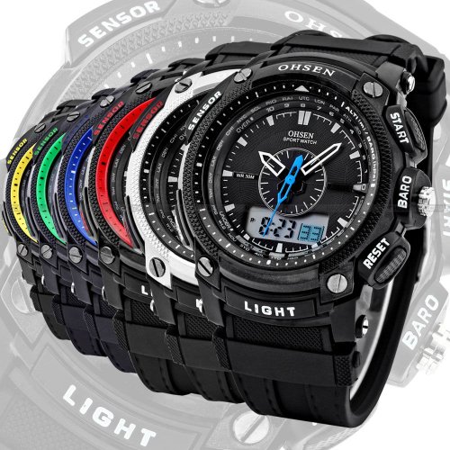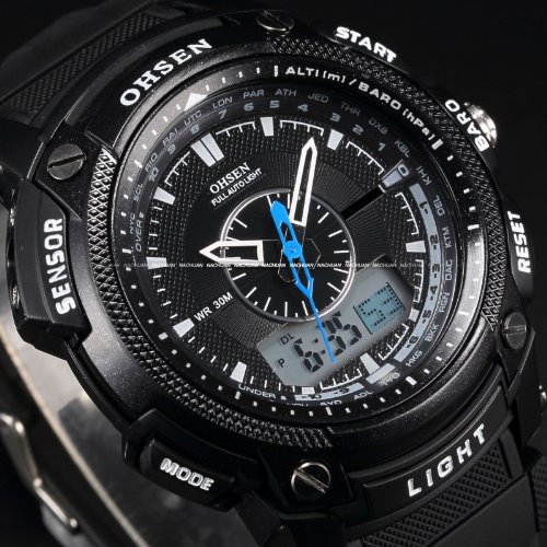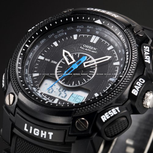 -. Title : OHSEN LCD デュアルコア ユニセックス スポーツ 日付・曜日 ストップウォッ機能付き ブラックラバーバンドウォッチOHS049