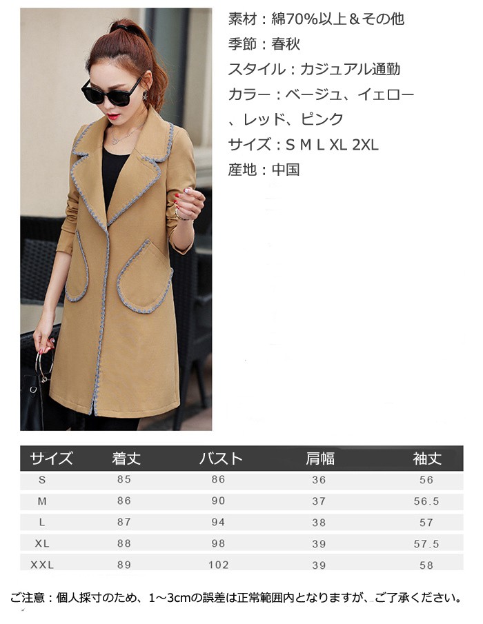 トレンチコート 春 トレンチコート レディース トレンチコート 春 大きいサイズ スプリングコート 春コート ロング 通勤 結婚式 2018春秋新作 スプリングコート レディース トレンチコート 春アウター ロングスリムフィットのトレンチコート2018年人気新登場!フィットしたウエストとボディラインにぴったりと沿ったシルエットが特徴です。季節やシーンを問わず活躍するワードローブの定番として、ベルトを締めたシックなスタイルから、ドレスやデニムの上からラフに羽織るコーディネートまで幅広く着こなせます。商品詳細素材:綿70%以上&その他季節:春秋スタイル:カジュアル通勤カラー:ベージュ、イェロー、レッド、ピンクサイズ:S M L XL 2XL産地:中国トレンチコート 春 トレンチコート レディース トレンチコート 春 大きいサイズ スプリングコート 春コート ロング 通勤 結婚式 2018春秋新作 スプリングコート レディース トレンチコート 春アウター ロング