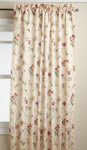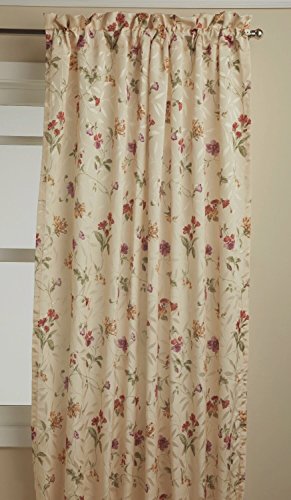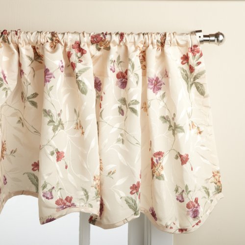 Deluxe heavy weight tone on tone jacquard tailored panel is woven in an all-over leaf motif using dull and shiny yarns for depth and interest and then further accented with a printed all-over scrolling floral motif. the matching scalloped valance is finished with a self fabric corded edge.Feature