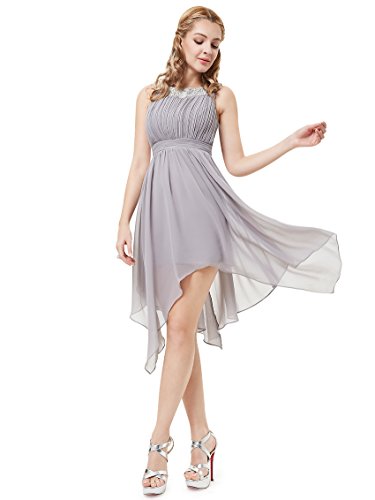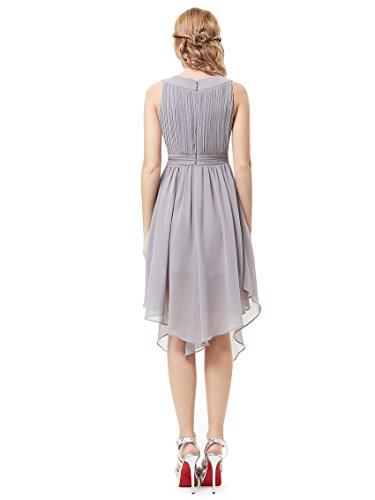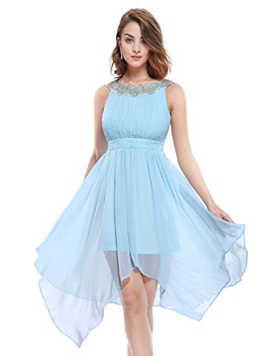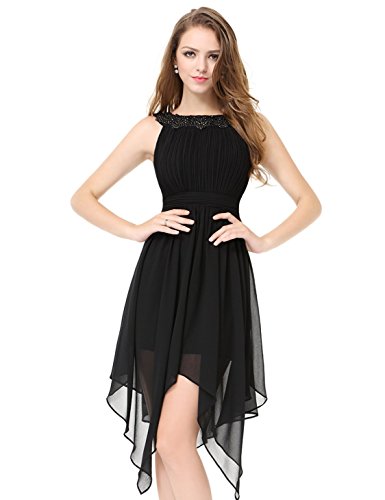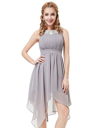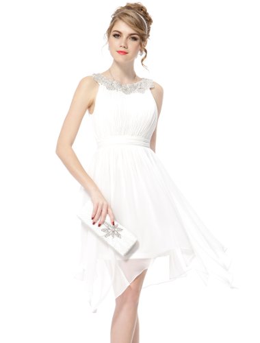 Round neck short party dress. Not padded. Stunning rhinestoned lace decorates the neckline area. Unique ruched bust and waist design. Stylish asymmetric bottom. Concealed zipper up the back. Lining, no stretch