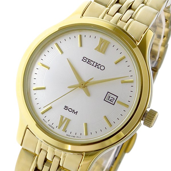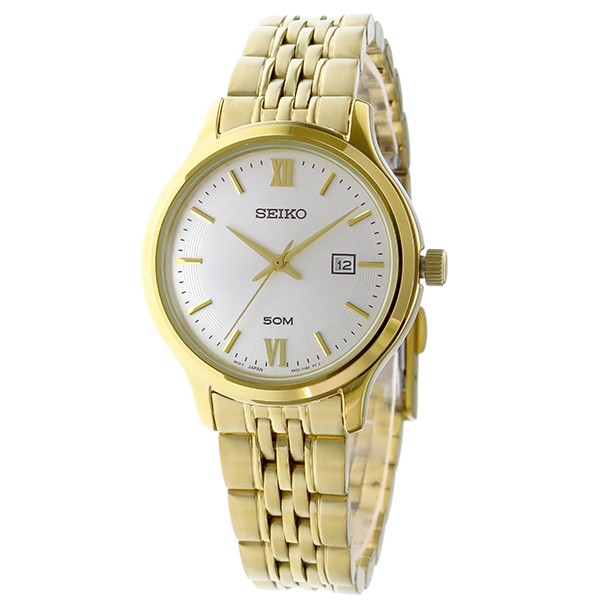 クオーツ、5気圧防水、日付カレンダー、カラー:ホワイトシルバー(文字盤)、ゴールド(ベルト)