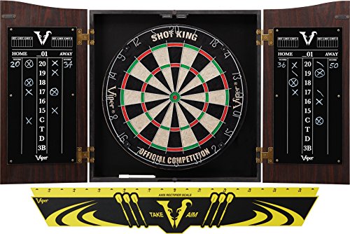 -. Feature : Comprehensive bundle features a dartboard cabinet, dartboard, steel tip darts, dry erase scoreboard, dry erase marker and mounting hardware / Open dimensions: 42" L x 21.5" W x 3" D; closed dimensions: 21" L x 21.5" W x 3" D. Measuring 18" in diameter and 1.5" D / Viper Shot King staple-free bullseye dartboard is constructed from self-healing sisal/bristle fibers compressed together, providing unsurpassed durability / Measuring 18" in diameter, the Viper Shot King is official tournament size; A movable number ring further extends the dartboard's life / Viper Shadow Buster cabinet mounted display light illuminates your dartboard; Viper laser throw/toe line marker allows for use even in daylight