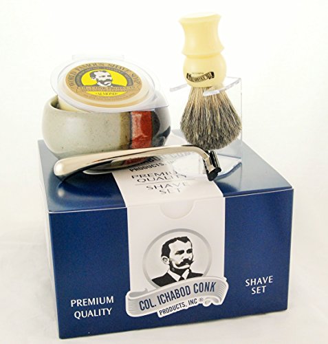 Kit includes Colonel Conk's world-famous glycerin shave soap, a deluxe quality boar brush handcrafted on the Isle of Man, a chrome double track razor and a hand-made Southwestern-style pottery cup for lather.Feature