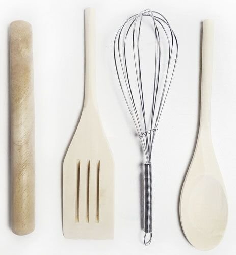 Studio : Sassafras Publisher : Sassafras Product Description Fun baking tool sets by Sassafras are the perfect starter set for the budding baker! These real kitchen tools are bright, engaging and all sized just right for smaller hands. The set includes the following utensils packaged in a colorful herb pot: measuring cups measuring spoons, wooden spoon, rolling pin, spatula, melon balller, pastry scraper, and whisk. Children will enjoy learning to measure using these kitchen utensils too. 0