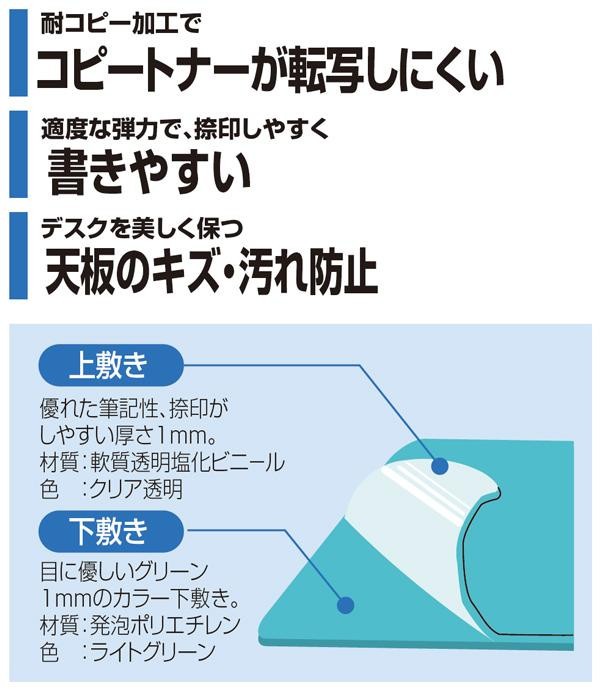 耐コピー加工タイプで、メモなどもはさめるグリーン地の下地付。デスクの天板を美しく保つデスクマットです。デスク天板JIS規格5号(ヨコ1060×タテ730mm)に最適なサイズです。 |