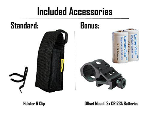 MOUNTABLE BUNDLE - Includes Holster and Clip for versatile carry plus an offset mount for convenient mounting and 2x LumenTac CR123A batteries to power your light.