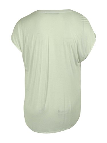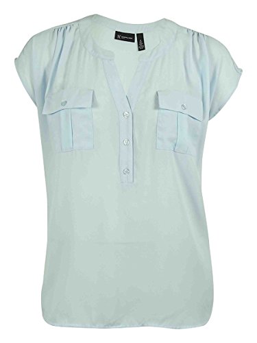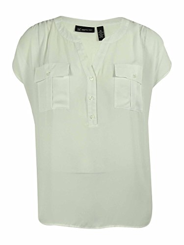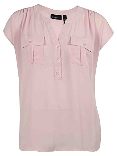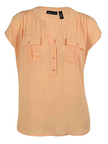 Blouse features no lining, split neckline, two front pockets, short sleeves, and pullover style.