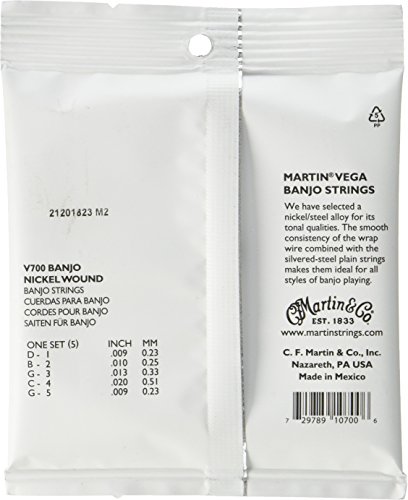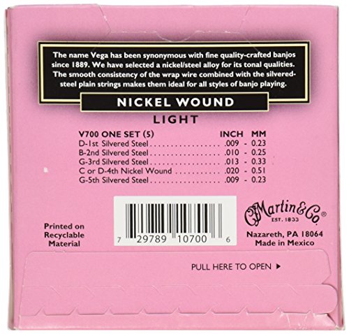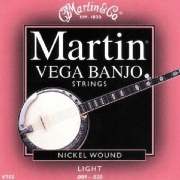 ReleaseDate : 2010-08-20 Studio : C.F. Martin Co. Publisher : C.F. Martin Co. Binding : Electronics Product Description Martin V700 Light Vega Banjo Strings employ a nickel/steel alloy for tonal qualities which are best suited to accent the strong resonating tendencies of most banjos. The name Vega has been synonymous with fine quality-crafted banjos since 1889. Martin's combined experience in instrument making, string winding, and comprehensive sound testing make Vega strings the best choice for your banjo. All raw materials are of premium quality to assure brilliance, clarity, and longevity. In addition, Vega strings are highly resistant to corrosion. The smooth consistency of the wrap wires makes them ideal for all styles of banjo playing, whether it be the short, snappy plectrum style; the quick, flowing Scruggs style; or the rhythm driving frailing technique. 0