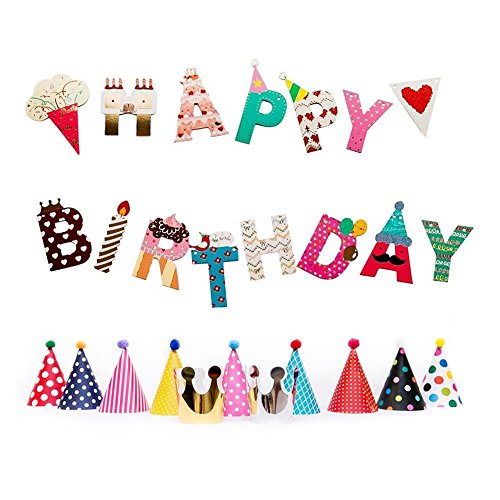 Efivs Arts Fun Colorful Gold Foiled Happy Birthday Banner Flags and Kids Party Hats and Crowns Set