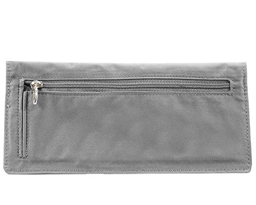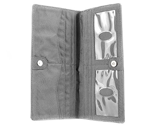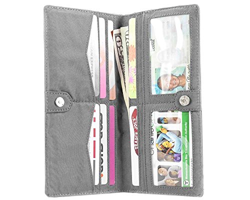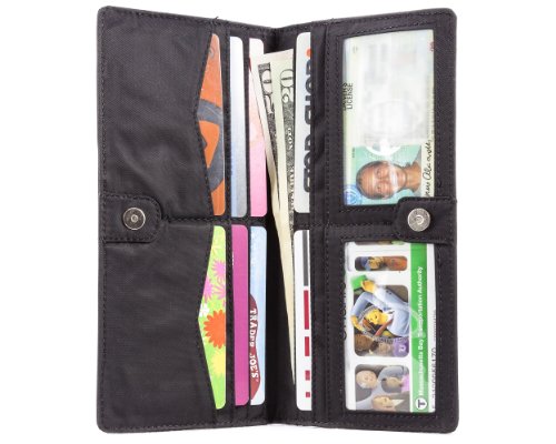 -. Feature : Ultra-thin checkbook wallet with logo emblem on outer flap featuring patterned lining and snap closure / Pockets lined with rubbery coating to prevent cards from sliding out / Accomodates 40 thick plastic cards, checkbook, and cash / 2 billfold/checkbook areas, 8 credit card pockets, 2 ID pockets / Measures 7-1/2 x 3-1/2 Inch