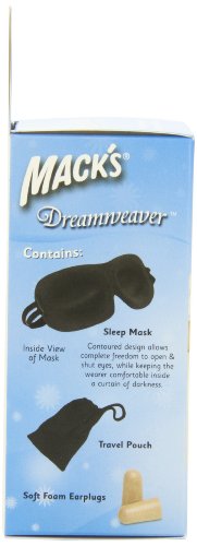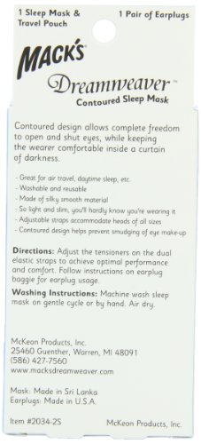 Contoured design allows complete freedom to open and shut the eyes while keeping the wearer comfortable inside a curtain of darkness. So light and slim, you'll hardly know you're wearing it. Features dual elastic straps with adjustable tensioners for optimum performance and comfort. Great for air travel, daytime sleep etc. Free pair of Mack's Soft Foam Earplugs and convenient travel pouch included.