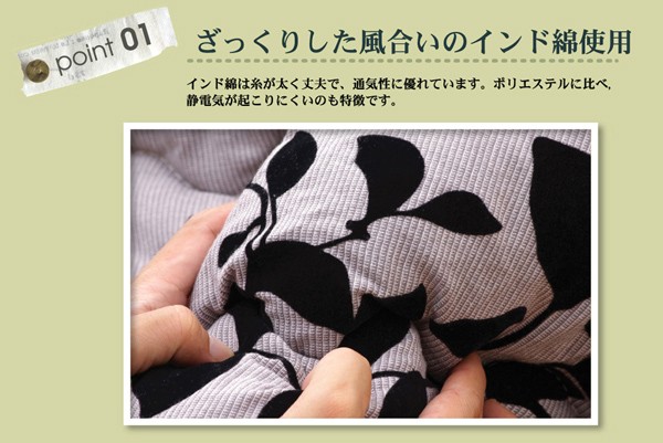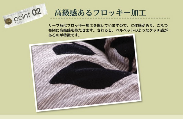 生地にインド綿を使用したこたつ布団です。シンプルモダンをテーマにデザインしており、少し大人で素材感のあるお部屋のイメージにぴったりです。インド産の綿は繊維が太く、引っ掛かりや摩擦に強く耐久性に優れています。ざっくりとした生地は肌触り、通気性が良く、ベトつかないサラッとした手触りが特徴です。また、綿素材はポリエステル素材に比べ、冬場気になる静電気も起こりにくくなっています。部分暖房のコタツは電気代もおトクです。