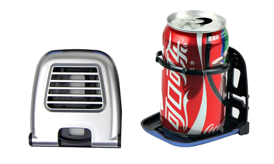 1. The rear side of the cup holder is fixed to the air outlet by means of two connecting rods inserted into the air outlet. A small tongue in the lower part of the cup holder can be used to withstand the outlet, thus forming a fixed posture for the cup holder.