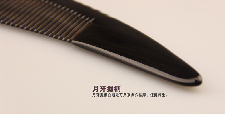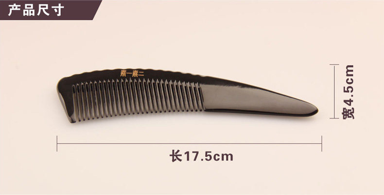 选用天然黑水牛角材料制作,根据牛角天然的弧度制作。齿间剃齿工艺保护秀发,梳子尾部可作用于点按相应的穴位。
