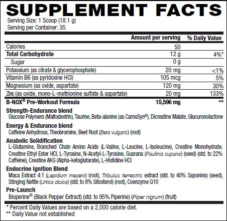 -. Binding : Health and Beauty -. Brand : Betancourt Nutrition -. Feature : Delivers that, 'one of a kind' explosive energy that pushes you to the insane pump you are looking for! / Just 50 Calories per serving! / ZERO Sugar added / Sustained energy rush with less chance of 'crsah or the "jitters' you get from other pre workout mixes. -. IsAdultProduct : 0 -. Label : Betancourt Nutrition -. Manufacturer : Betancourt Nutrition -. ProductGroup : Health and Beauty -. ProductTypeName : HEALTH_PERSONAL_CARE -. Publisher : Betancourt Nutrition -. Studio : Betancourt Nutrition -. Title : Betancourt Nutrition - B-Nox Pre Workout Drink Mix, 35 servings Fruit Punch Net wt 22.3 Oz (1.3 lbs)