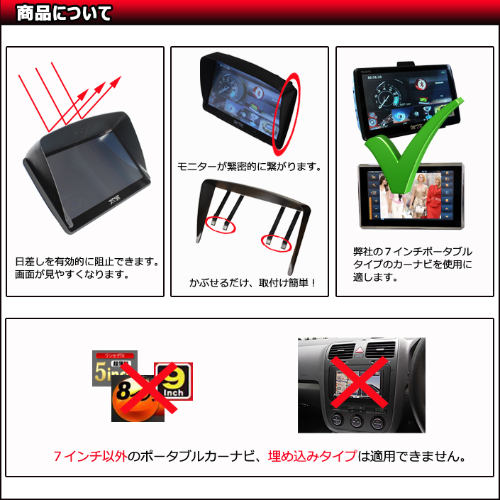 ●この製品をポータブルナビに装着することで、画面が日差しで見にくくなるのを軽減します。