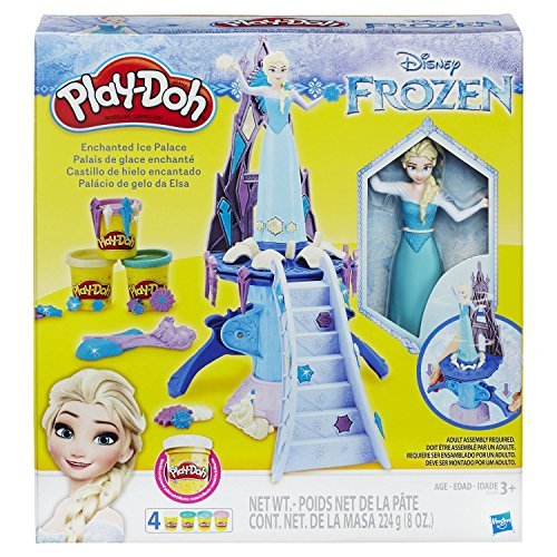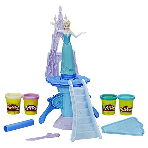 Have fun re-creating favorite moments from the Disney Frozen movie! Visit Elsa's palace and create her ice magic with Play-Doh compound. Send Elsa spinning through swirls of Play-Doh ice and snow by pressing the levers! Make a cape she can wear and decorate her dress with snowflakes. Cover the castle in icicles and even more snowflakes, too. Complete the fun with molds of Olaf, Marshmallow, and other fun shapes, and sparkly white compound helps creativity shimmer!Feature