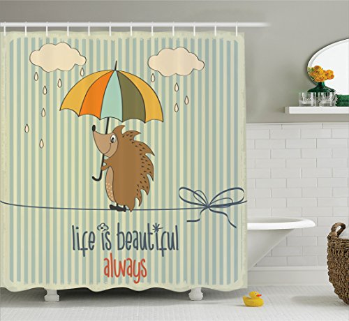 Ambesonne Quotes Decor Collection, Hedgehog with Umbrella under Rain and Phrase Life is Beautiful Always Pattern, Polyester Fabric Bathroom Shower Curtain Set with Hooks, Orange White Blue Tan
