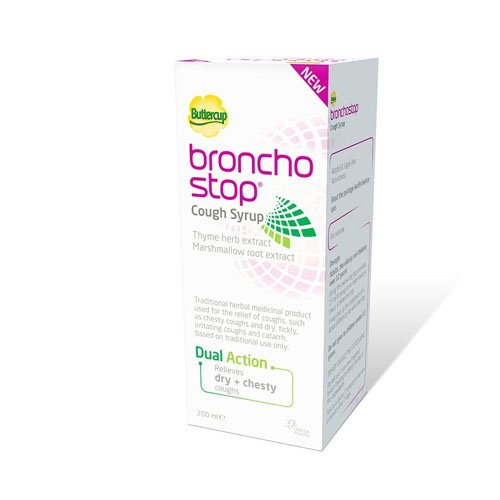 Studio : Healthcenter Publisher : Healthcenter Binding : Health and Beauty Product Description Bronchostop, our first treatment to relieve ANY cough. Not sure what cough type you have or does it changes from dry to chesty or back? New Bronchostop contains a new and unique combination of ingredients to help relieve any cough: dry, tickly, chesty, mucus, catarrh based on traditional use. Buttercup Bronchostop Cough Syrup. A traditional herbal medicinal product used for the relief of coughs, such as chesty coughs and dry, tickly, irritating coughs and catarrh, exclusively based upon long-standing use as a traditional remedy. Always read the leaflet. Bronchostop is available in a sugar-free syrup for at home and easy, on-the-go pastilles, all non-drowsy and alcohol-free! 0