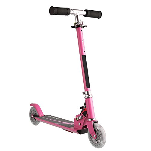 -. Feature : 3-Level Adjustable Handlebars: Adjustable handlebar range 63-85cm/24.8-33.46 inch, which accommodates your little ones as they grow, What's more, the mini scooter with CE safety certification and the smoothest, quietest 120 degree lean-to-steer mechanism. Very suit for kids age 4-10. / LED Lighted UP Wheel: Your little boy or girl will really stand out from the crowd!They will also scoot in style, the LED lights embedded in the wheels light up automatically when they speed along. / 3 Seconds Assembly - Folding with 3.4 lbs lightweight equiped kickstand make it convenient for boys or girls carry anywhere and ideal for storage. And the patented quick-react rear wheel foot brake is easily managed by the children and soon they have confidence being in full control of this great scooter. / Material: Aircraftgrade aluminum alloy frame and reinforced durable deck,adding stability and comfort to your riding experience, can hold riders up to 176lbs. Carbon steel alloy & adjustable T locking handle bar with non-slip handle, It's very comfortable for holding. / Safe: Super smooth and high durability 100mm LED light up PU wheels with ABEC-7 bearings reduce vibration and make a smooth and quiet ride. Develops kids balance, co-ordination and motor skills.