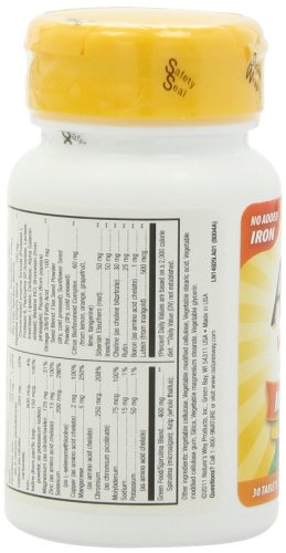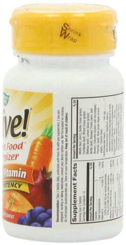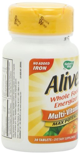 -. Binding : Health and Beauty -. Brand : Nature's Way -. Department : Health and Beauty>Health and Wellness -. EAN : 0033674149294 -. Feature : Alive supplements are the ultimate Whole Food Energizers™. / Alive supplements are the ultimate Whole Food Energizers™-- with more invigorating nutrients from more natural sources than any other product. / In comparison tests with other whole food brands, Alive! tablets were the only ones to completely disintegrate in 20 minutes or less (the proper time to ensure uptake into the body). -. IsAdultProduct : 0 -. IsAutographed : 0 -. IsMemorabilia : 0 -. Label : Nature's Way -. Manufacturer : Nature's Way -. Model : 14929 -. MPN : 14929 -. NumberOfItems : 1 -. PackageQuantity : 1 -. PartNumber : 14929 -. ProductGroup : Health and Beauty -. ProductTypeName : HEALTH_PERSONAL_CARE -. PublicationDate : 2011-01-06 -. Publisher : Nature's Way -. Size : 30 -. Studio : Nature's Way -. Title : Alive Max Potency (No Iron Added) Multivitamin, 30 tablets -. UPC : 033674149294
