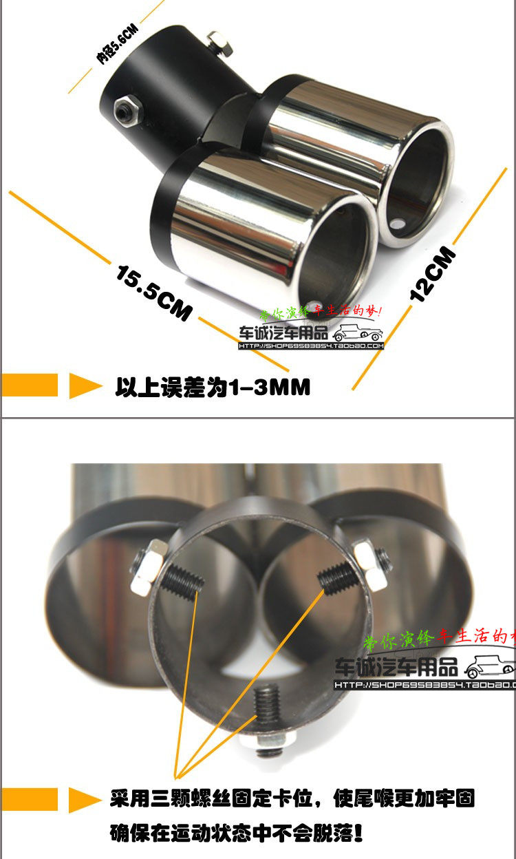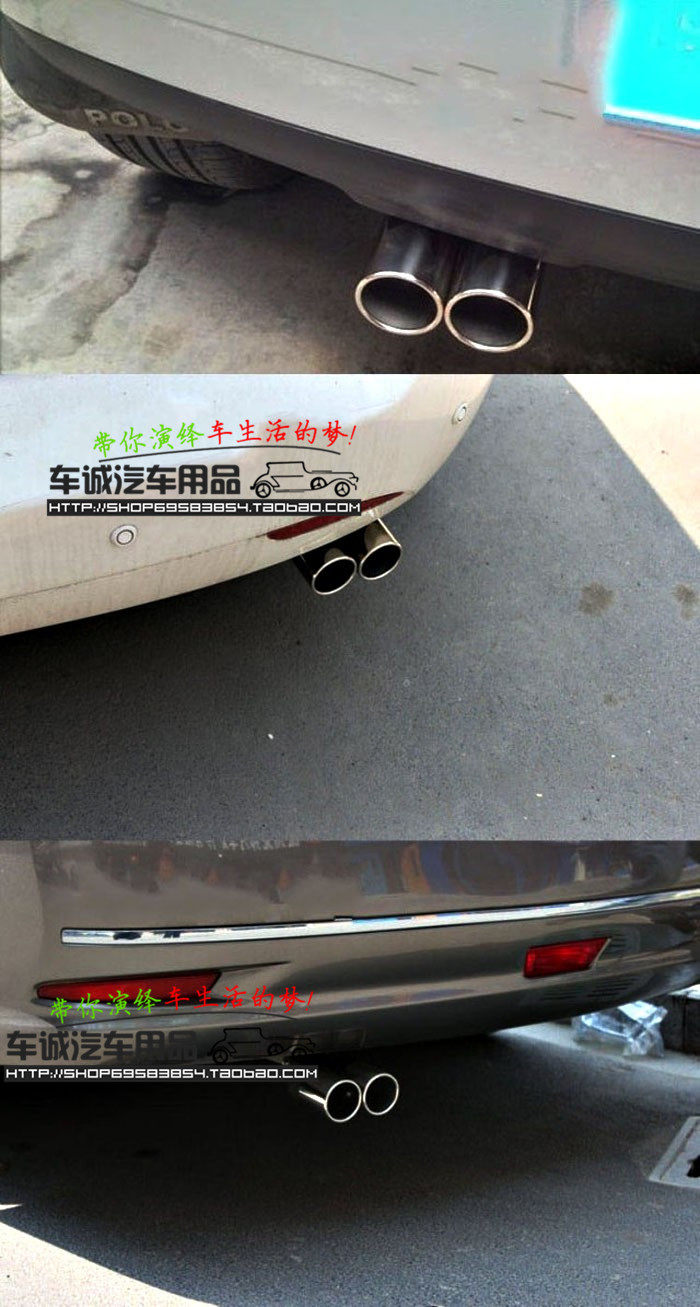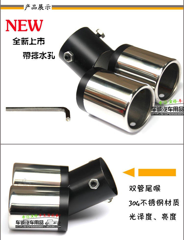 Automobile silencer decorative tail throat. In addition it can protect the carto prevent the tail pipe deformation, and at the same time and turbulence pressurization, also can to a certain extent, weakened the tail pipe noise,and make good voice became slightly soft. Also have strong adornment effect!