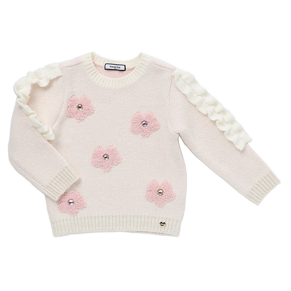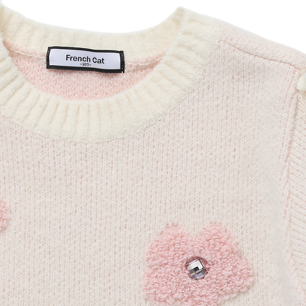 상품설명 오프 화이트 컬러의 플라워 스웨터입니다. 포근하고 부드러운 스웨터 아이템으로, 소매에는 러블리한 프릴이, 앞판에는 핑크 부클사인 플라워 장식이 패턴처럼 들어가 있습니다. 치랭스와 코디하기 좋은 윈터 아이템입니다.