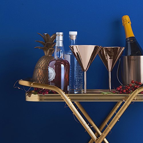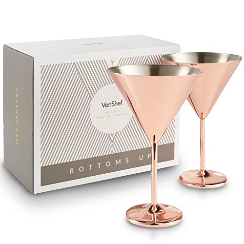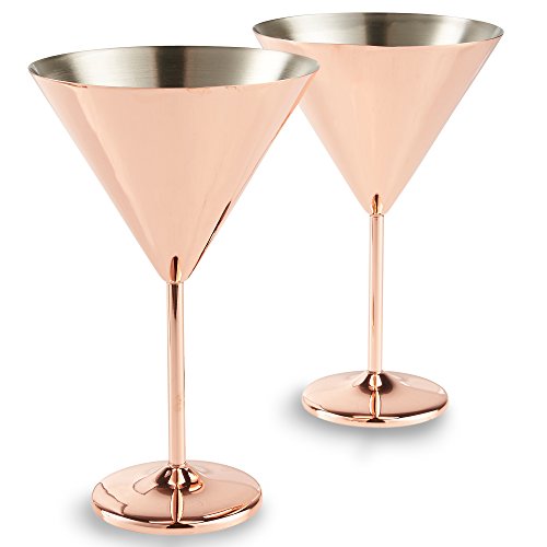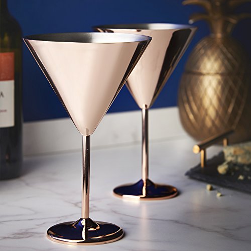 VonShef Set of 2 Martini Glasses Add a modern twist to your martini cocktails with the VonShef Set of 2 Martini Glasses. Constructed from high quality stainless steel with an on-trend copper finish, these practical and sophisticated glasses are shatterproof - and will outlast their traditional glass counterparts. As stainless steel is heavier than glass there's less chance of your martini tipping over. Plus, as stainless steel boasts insulating properties, your drink will stay chilled for longer. Elegant Modern Design As well as martinis, the glasses are also ideal for serving other types of cocktails, cold drinks and ice creams, sorbets and prawn cocktails too. Elegantly designed with a long stem and low wide bowl for garnishing with fruit or ice. Features a tarnish-resistant brushed satin interior and exterior. Cocktail Dinner Parties Perfect for use in the home as well as cocktail and dinner parties, picnics, road trips, boat trips or relaxing in the garden on a sunny day. Supplied in an attractive gift box - perfect for a Christmas, birthday or housewarming present. Each glass has a 15oz capacity and measures approx. 7.5" X 5" (Length X Diameter). Hand wash only - not suitable for dishwasher. 0 |
