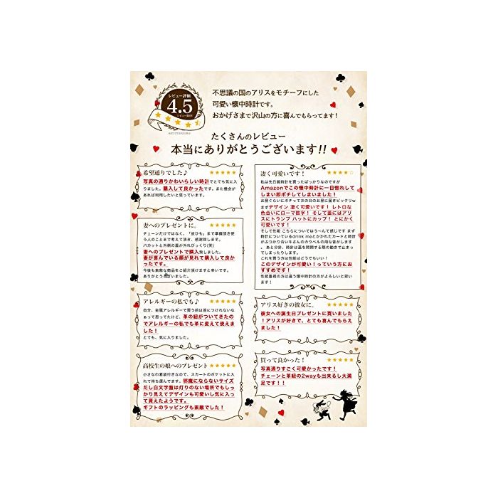 【 안심 고평가“리뷰 평균4.50점“ 누계 판매수3700 개돌파!! 】많은 고객으로부터의 귀엽다,고품질,사용법 간단과 기뻐해지고 있습니다! *고평가의 이유는 오리지날이 귀여운 디자인과 철저히 한 품질관리와 리즈너블(reasonable)인 가격 *처음하시는 분이나 아이에게도 안심 취급 설명서 첨부 와 *문자판의 로마숫자나 트럼프 체격이 앨리스감을 한층 더 연출
