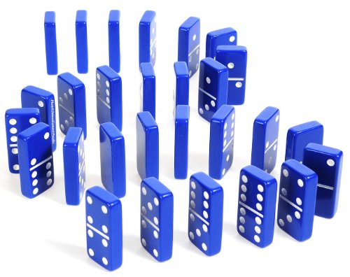 - Feature : Big Bold Jumbo (Tournament Size) Dominoes in Solid BLUE. / Dominoes measure 2 3/16 x 1 1/16 x 7/16 inches. / Double 6 set has 28 dominoes. Rounded edges feel great in one's hand. / Stores in a vinyl case (of very average quality) with snap on front. / Traditional recessed (wear-resistant) bright white dots / pips.