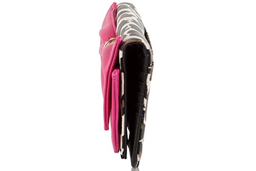 Feature : Fold over mangnetic snap closure / Exterior features front sequins bow detail and back slip pocket / Interior features zip pocket, 2 bill slots, 8 card slots, ID window / Detachable cross-body strap with chain detail 25" shoulder drop / Wallet: 10"x 7"x 1" (WxHxD) 25" strap drop