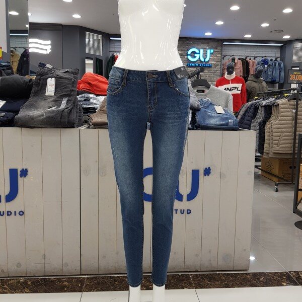 GU# 겟유즈드 (여성) 워싱미드라이즈스키니 FULFCDK504 미디움톤의 은은한 캣브러시 힙의 요크곡선이 여성스러운 디자인. 데일리머스트 아이템 . 마네킨27착장.