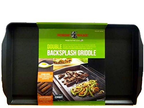 Studio : Nordic Ware Publisher : Nordic Ware Product Description Nordic Ware's Double Backsplash Griddle spans two burners for twice the cooking capacity and has premium nonstick surfaces for easy clean up. The raised edge makes flipping food easy and reduces spattering. An angled surface diverts oil and grease away from food and into a collection reservoir. Made of cast aluminum, which provides even heat distribution, controlled cooking and durability. 0