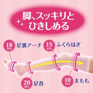 足裏アーチ18hPa、足首20hPa、ふくらはぎ15hPa、太もも10hPaで脚をしっかりひきしめます。足裏アーチ着圧が、ヒールで崩れがちな足裏アーチをサポート。