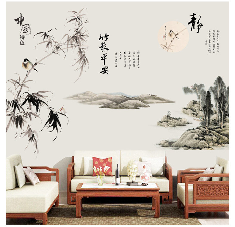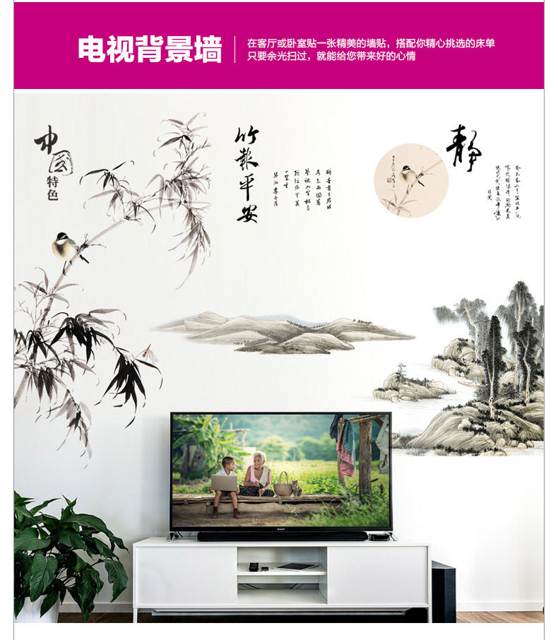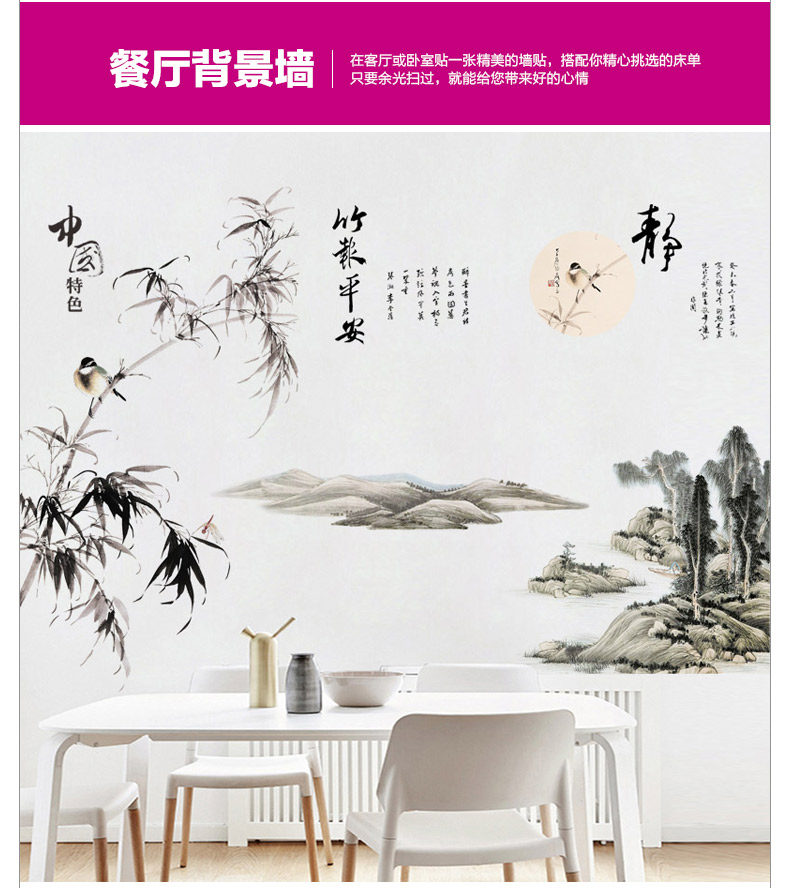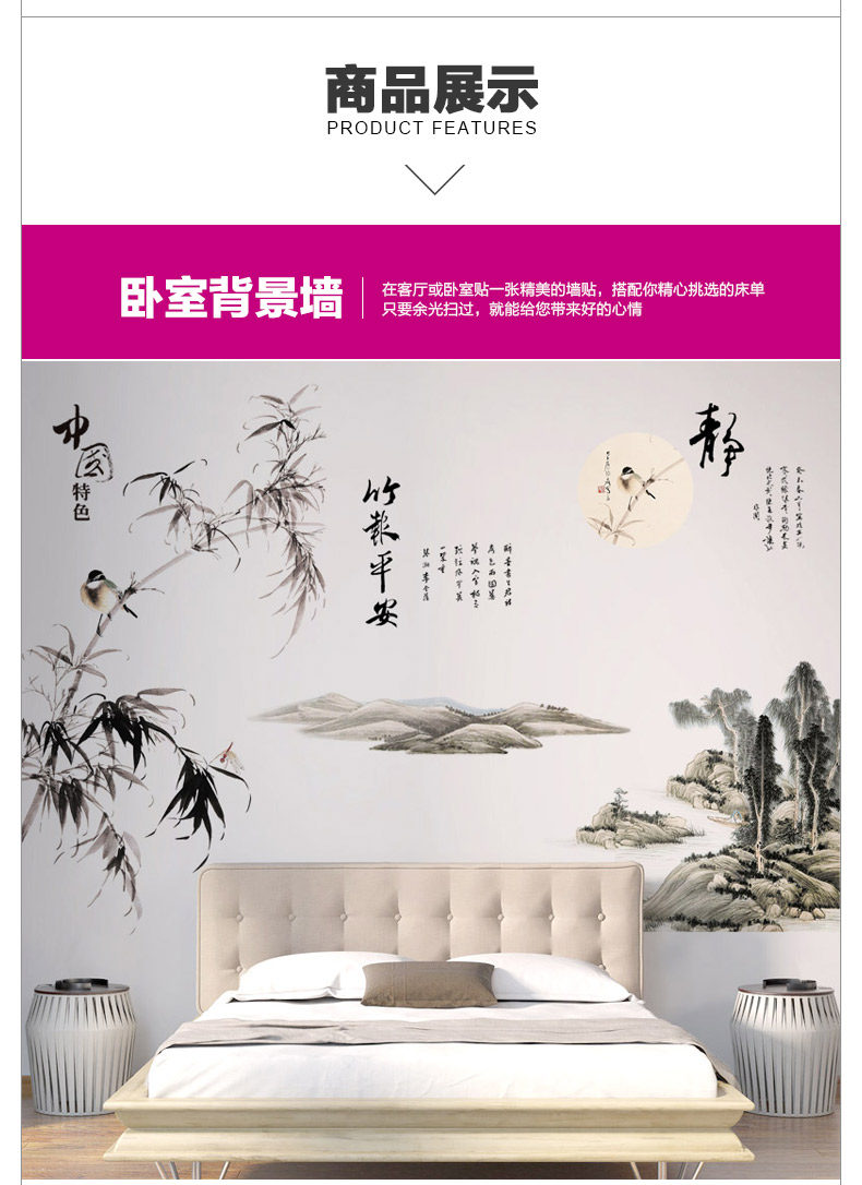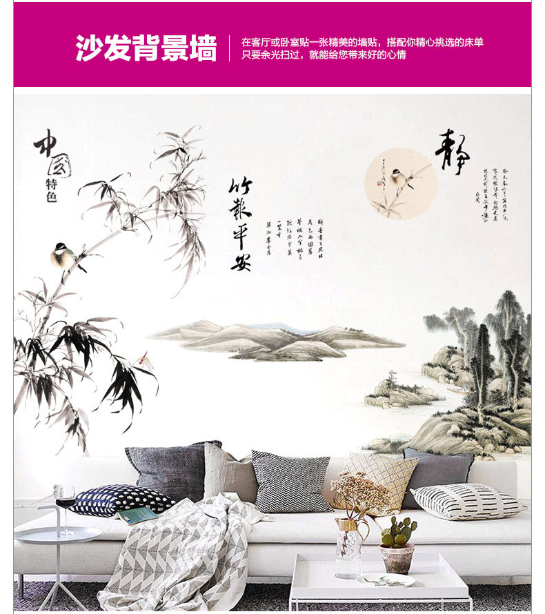 墙贴中国风中式山水画贴纸 自粘壁纸卧室装饰客厅背景墙防水贴画