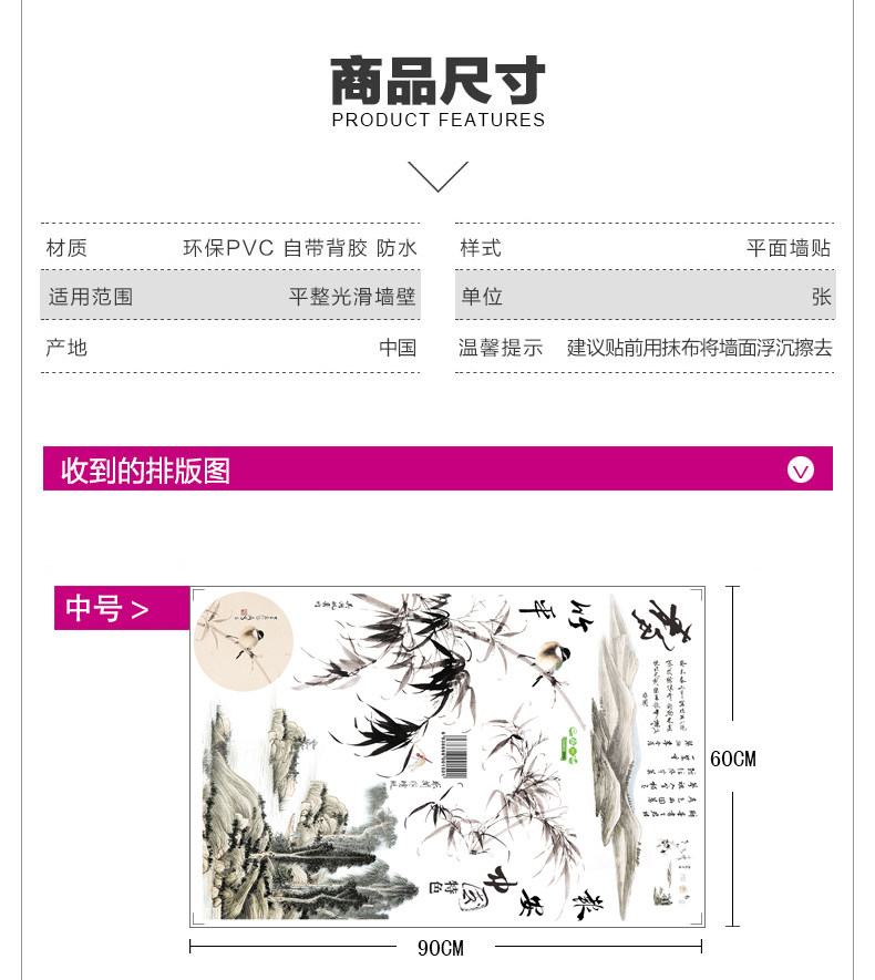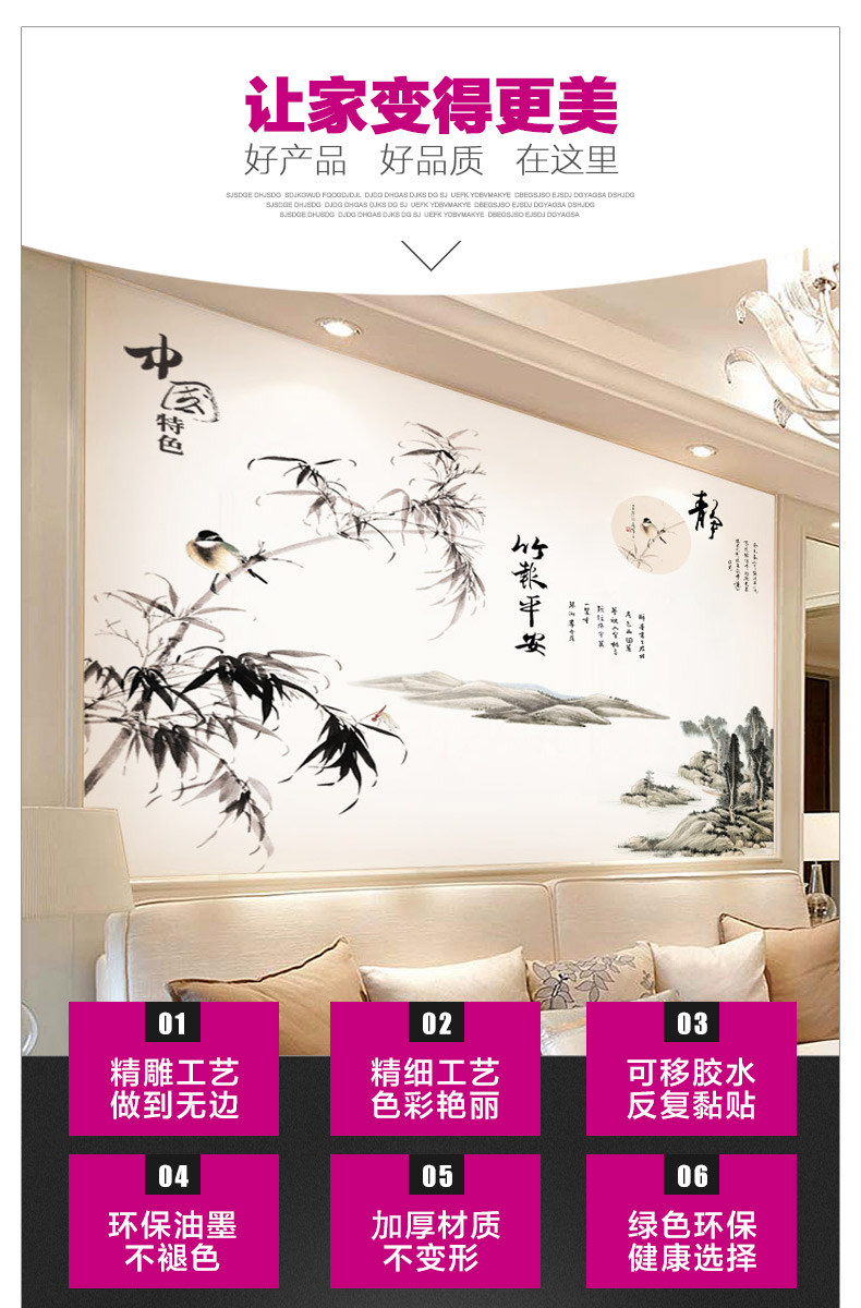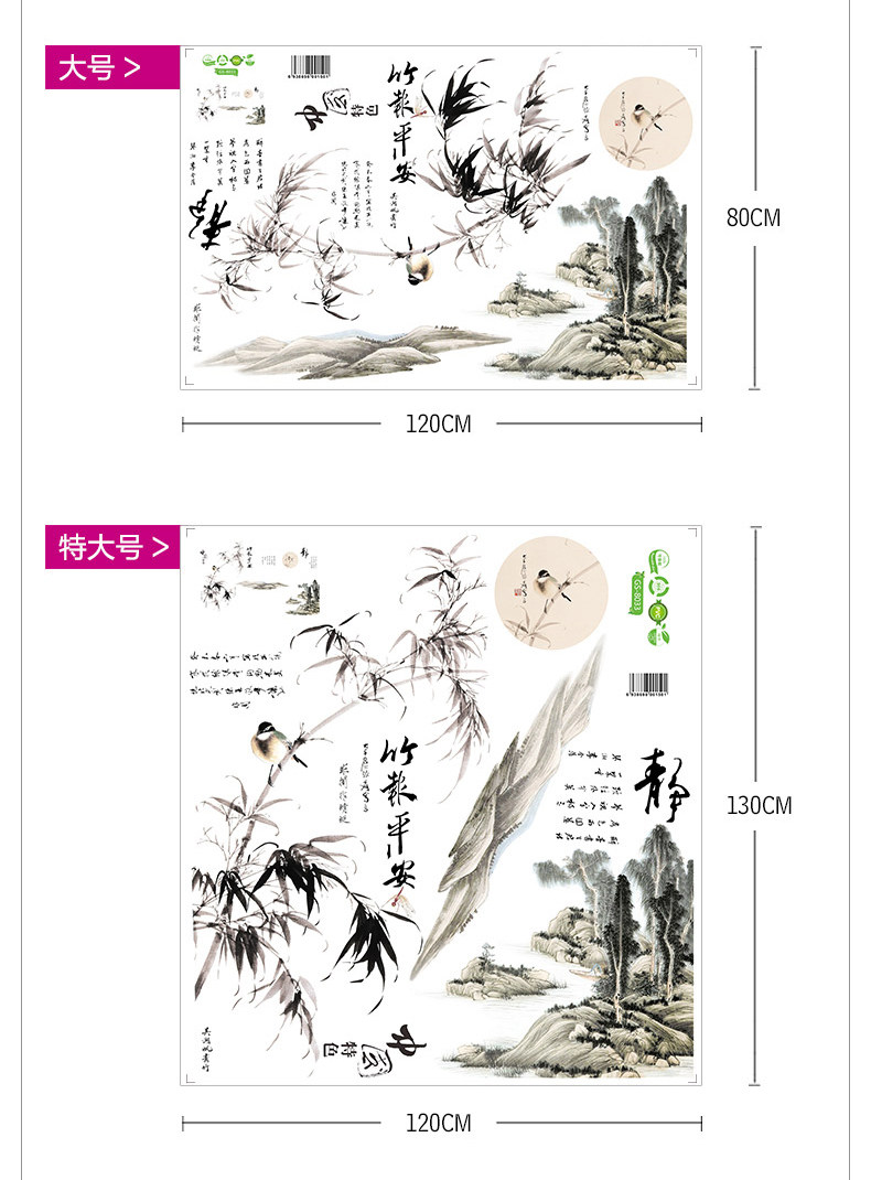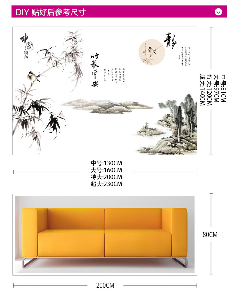 墙贴中国风中式山水画贴纸 自粘壁纸卧室装饰客厅背景墙防水贴画
