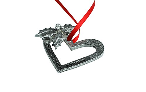 Features a Rustic Hanging Heart Which Hangs From a Red Ribbon with a Cast Holly in The Left Hand Corner. The text is hand stamped so no piece is the same.