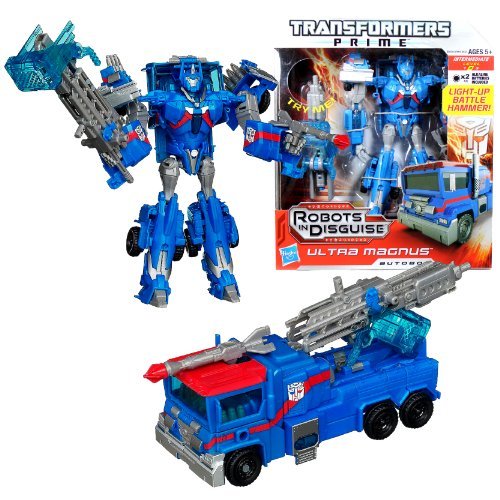 -. Binding : Toy -. Brand : Transformers -. EAN : 0713733896467 -. Feature : Includes: Autobot ULTRA MAGNUS with Light-Up Battle Hammer that Converts to Blaster Cannon (Vehicle Mode: Truck) / Figure measured approximately 7 inch tall / Produced in year 2012 / For age 5 and up -. IsAdultProduct : 0 -. Label : Hasbro -. Manufacturer : Hasbro -. ProductGroup : Toy -. ProductTypeName : TOYS_AND_GAMES -. Publisher : Hasbro -. Studio : Hasbro -. Title : Hasbro Year 2012 Transformers Robots in Disguise Prime Series 1 Voyager Class 7 Inch Tall Robot Action Figure #6 - Autobot ULTRA MAGNUS with Light-Up Battle Hammer that Converts to Blaster Cannon (Vehicle Mode: Truck) -. UPC : 713733896467