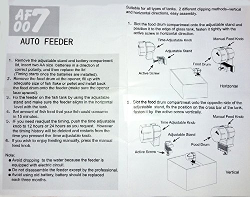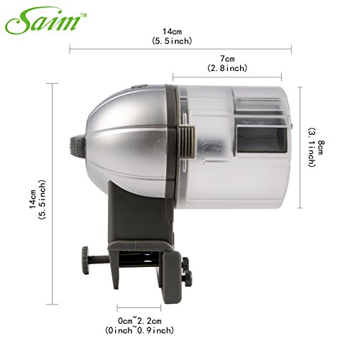 -. Binding : Misc. -. Brand : Aquarium Feeder -. EAN : 0709112923060 -. Feature : Set it and let if feed your fish everyday. NOTE: Pls follow the easy start guide. / Large capacity food drum (comes with an extra small food drum), adjustable setting / Two kinds if time setting: 12 hours feed and 24 hours feed. (If you wish to enjoy feeding manually, press the manual feed knob) / You can ajust the food amount so your fish can consume in 15 minutes. / It fits on most aquariums and includes a universal installation clamp and suction to make set-up easier for you. -. Label : Saim -. Manufacturer : Saim -. PackageQuantity : 1 -. ProductGroup : Pet Products -. ProductTypeName : PET_SUPPLIES -. Publisher : Saim -. Studio : Saim -. Title : Saim® Daily Double II Battery-Operated Automatic Fish Feeder w Extra Food Drum -. UPC : 709112923060